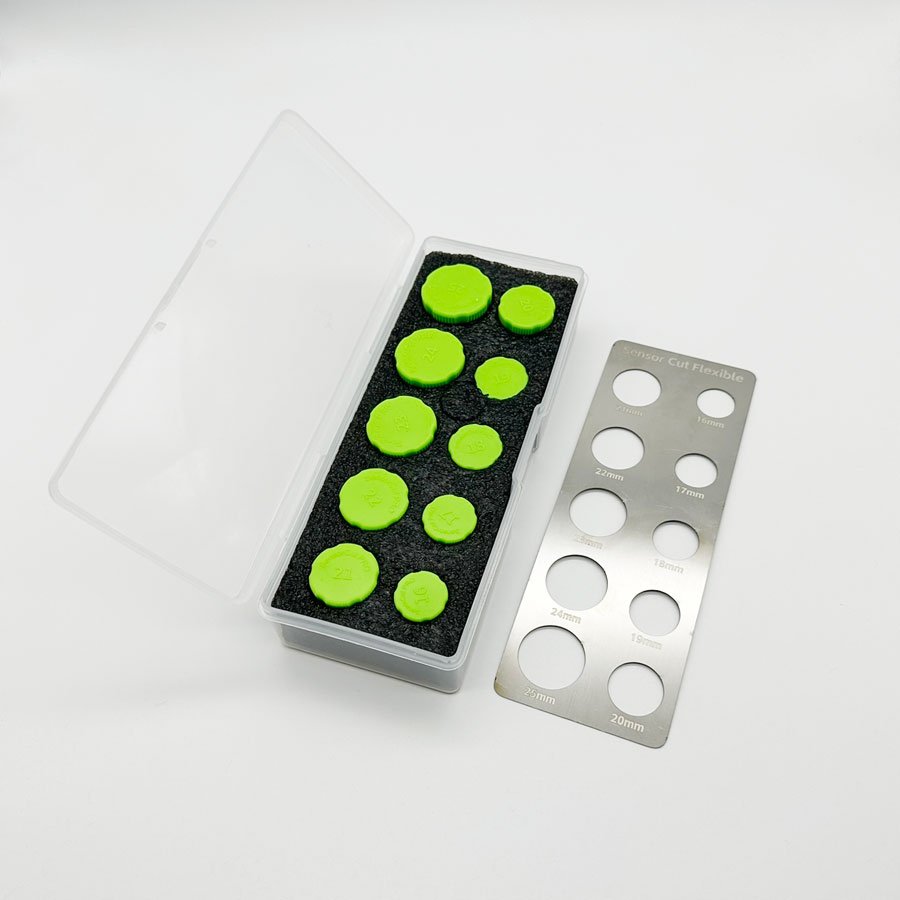 Parkavimo jutiklių pjovimo įrankiai pagaminti iš specialaus plastiko, kuris leidžia savo aštrumu išpjauti plėvelėje jutikliams skirtą skylę. Puikus pagalbininkas, siekiantiems kuo greičiau ir gražiau išpjauti reikiamas plėvelės vietas. Rinkinį sudaro 10 vnt. skirtingų dydžių apskritimai